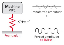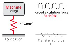 When part of a machine is supported by vibration isolation rubber we define the machine’s excitation force as “f0″and the excitation amplitude of the ground as “a0”. The transmitted force to the ground is defined as “F” and the transmitted amplitude to the machine as “a”. We express this phenomenon by following an “F1” formula called “vibration transmissibility”.