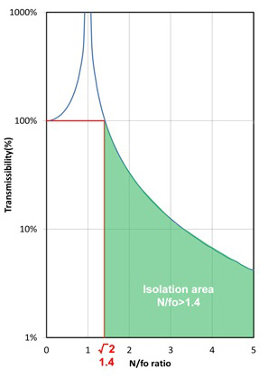 Figure.1 is a “vibration transmissibility curve”. Vibration transmissibility is determined by the ratio between excitation frequency (=N Hz) and natural frequency (=fo Hz). If this value (N/fo ratio) becomes 1, vibration will be resonated and amplified to an unlimited degree. In order to create an isolation effect, we carefully select the spring stiffness of the vibration isolation rubber and tune the N/fo ratio above 1.4.