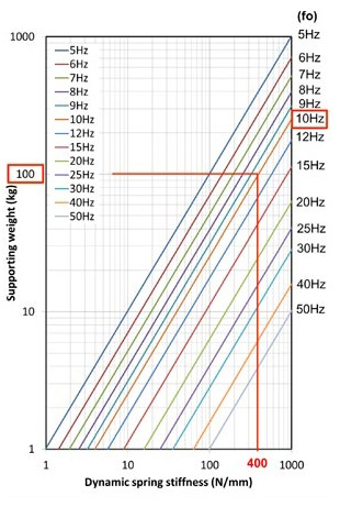 Example: Using the above graph, if the supporting weight per mount is 100kg and targeted natural frequency (fo) is 10Hz, the required dynamic spring stiffness of the vibration isolation rubber mount becomes 400N/mm. The Dynamic Spring Stiffness of rubber is typically 1.2 to 1.4 higher than static spring stiffness,. So in this case, the required static spring stiffness range is approximately 285 to 330N/mm.